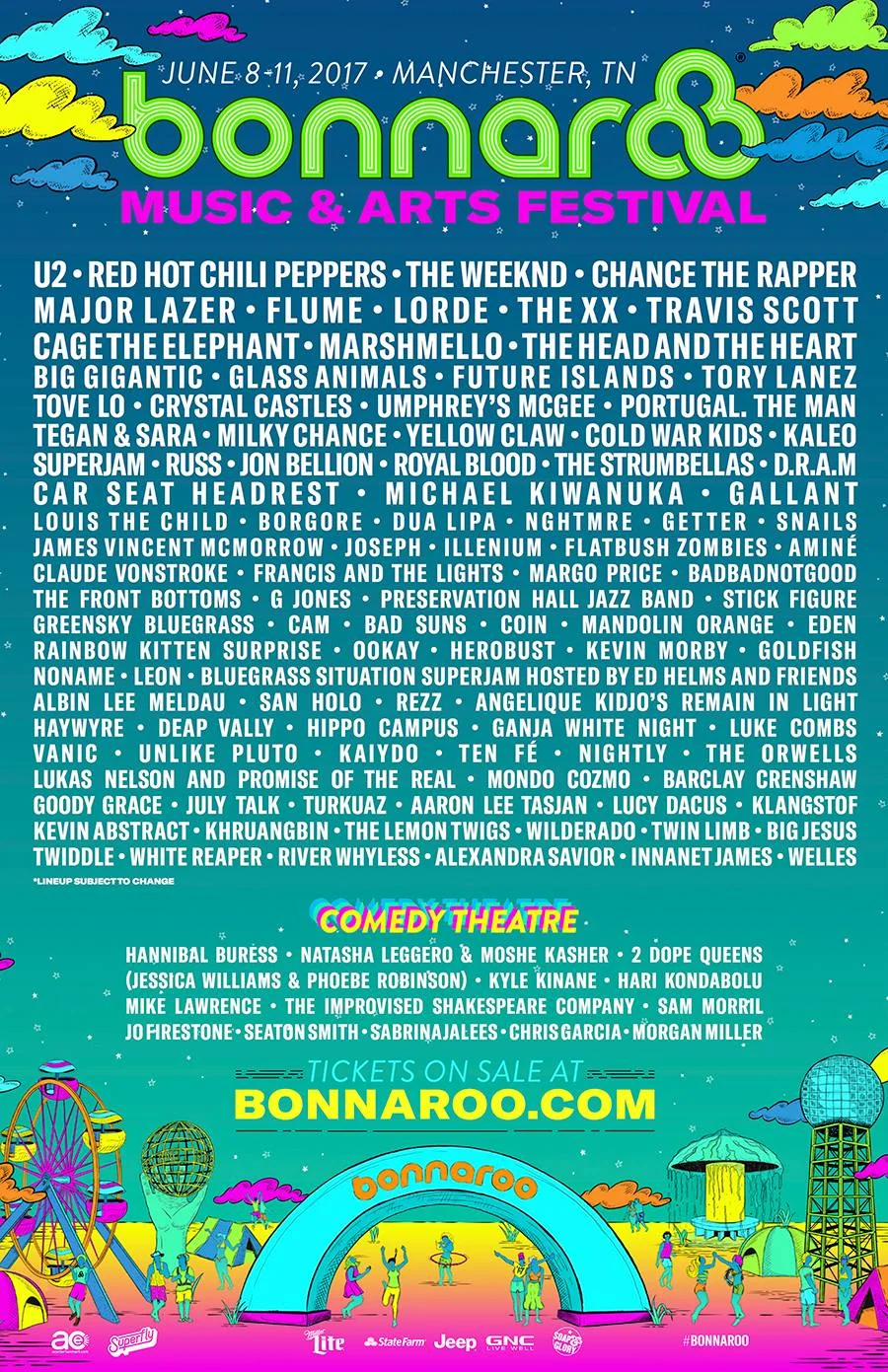 lineup is below. The 2017 Bonnaroo Music and Arts Festival will take place June 8 – 11, held as always at Great Stage Park (aka “The Farm”), the spectacular 700-acre farm and event space located just 60 miles south of Nashville in Manchester, TN.
