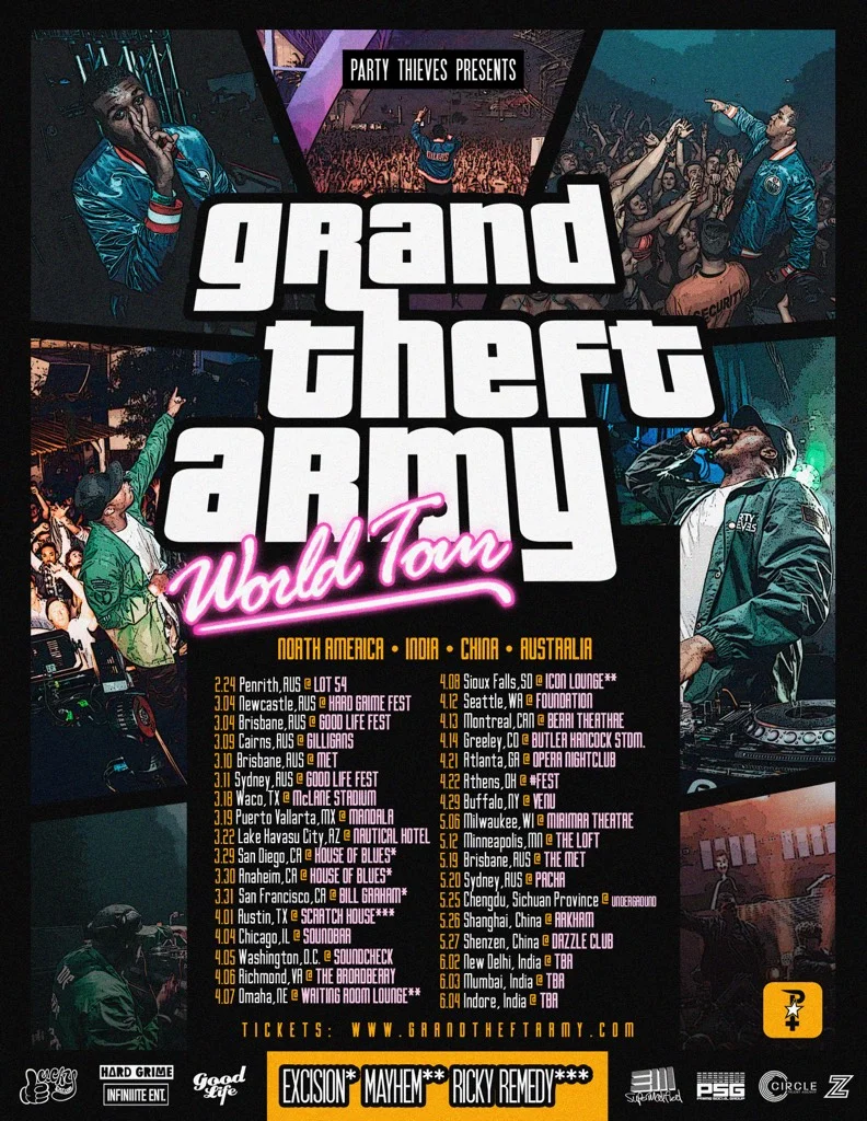 After completing his packed out and trapped out Max Capacity Tour, Party Thieves is back on the road again, but this time for his headlining Grand Theft Army World Tour. He is accompanied by special guests Mayhem and Ricky Remedy, as well as some shows alongside bass legend Excision.