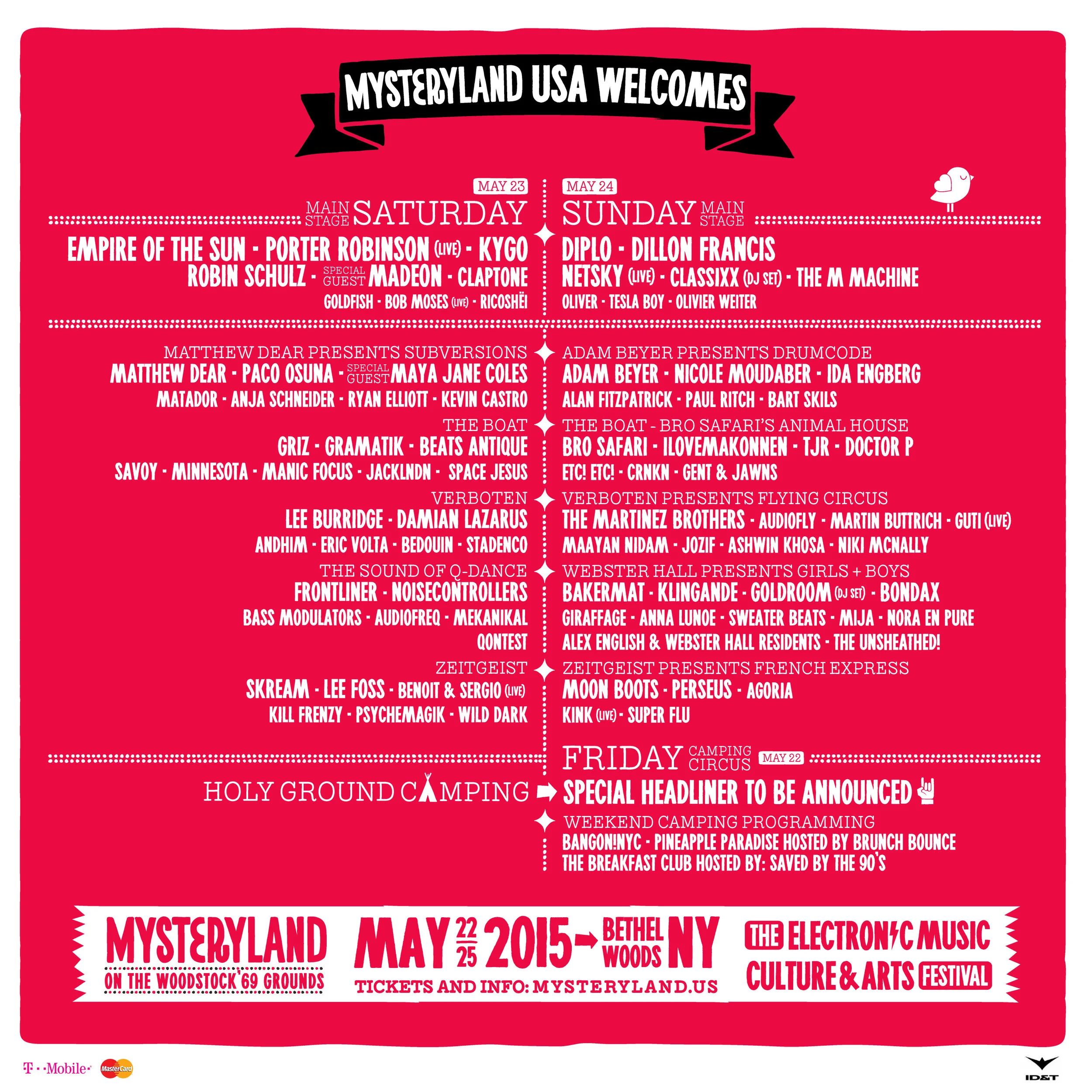 MYSTERYLAND USA 2015 INVITES DIPLO, EMPIRE OF THE SUN, PORTER ROBINSON, KYGO, DILLON FRANCIS, ADAM BEYER, NICOLE MOUDABER, MATTHEW DEAR, PACO OSUNA, MAYA JANE COLES, GRIZ, BRO SAFARI, GRAMATIK, BEATS ANTIQUE, LEE BURRIDGE, DAMIAN LAZARUS, THE MARTINEZ BROTHERS, BAKERMAT, SKREAM, LEE FOSS, MOON BOOTS, PERSEUS AND MANY MORE - FOR ITS SECOND NEW YORK EDITION AT THE WOODSTOCK ‘69 SITE.