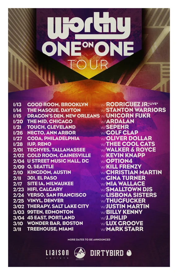Wrapping up yet another prolific year of upholding the esteemed Dirtybird BBQs to maintaining his own label, the head honcho of Anabatic Records and one of the four founding fathers of the Dirtybird Party, Worthy, is excited to announce his "One-on-One" tour, which will see host to a flock of special guests joining him on different dates across North America and span from his performance on Holy Ship all the way to Miami Music Week.