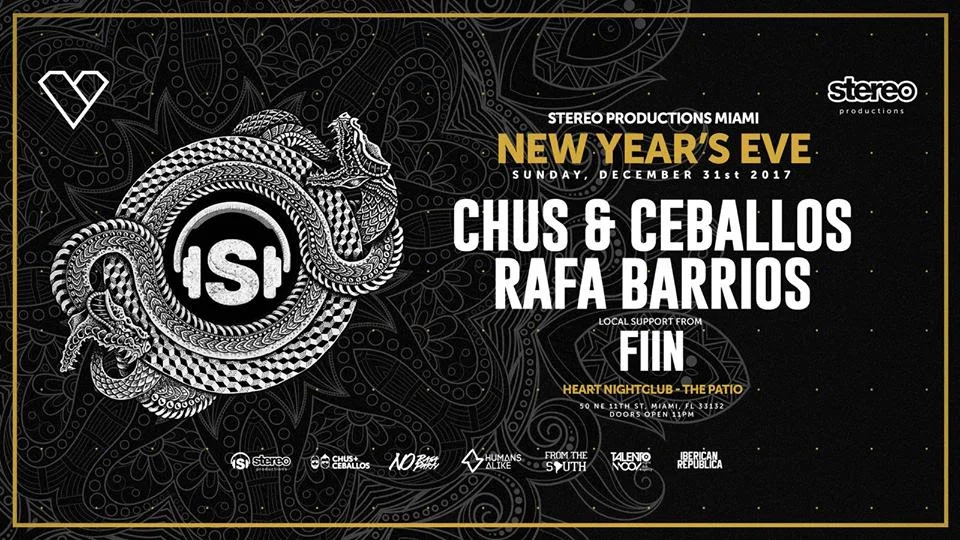 Ring in the official New Year with what is sure to be a marathon set from crowd-pleasers Chus+Ceballos, They have been lighting up dance floors for years now with their tribalistic approach to dance music. Melding the worlds of house and techno with trademark ever-present drums, Chus+Ceballos know how to throw down a memorable set. Years of dedication, hard work, versatility and genuine love of their work marks this duo as one of the world's most prolific. Joining them will be Stereo Productions labelmate and Heart favorite Rafa Barrios, as well as local support from Fiin.
