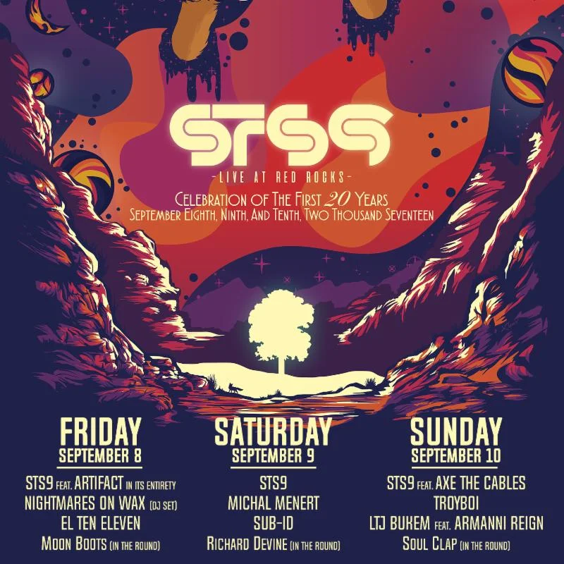 STS9 will begin the festivities on Friday, September 8 by performing their highly regarded album Artifact live in its entirety for the first time ever since its 2005 release and they'll wrap the weekend with an acoustic Axe The Cables set during their full show on Sunday, September 10. Supporting STS9 on this run will be Nightmares on Wax(DJ set), El Ten Eleven and Moon Boots (in the round) on September 8, Michal Menert, Sub-ID and Richard Devine (in the round) on September 9, and Troyboi, LTJ Bukem featuring Armanni Reign and Soul Clap (in the round) on September 10. The band's annual run at Red Rocks will mark their 15th consecutive year at the famed Colorado venue and bring their overall tally there to 23 shows. Tickets go on sale Friday, April 21, with a limited pre-sale beginning on Wednesday, April 19.