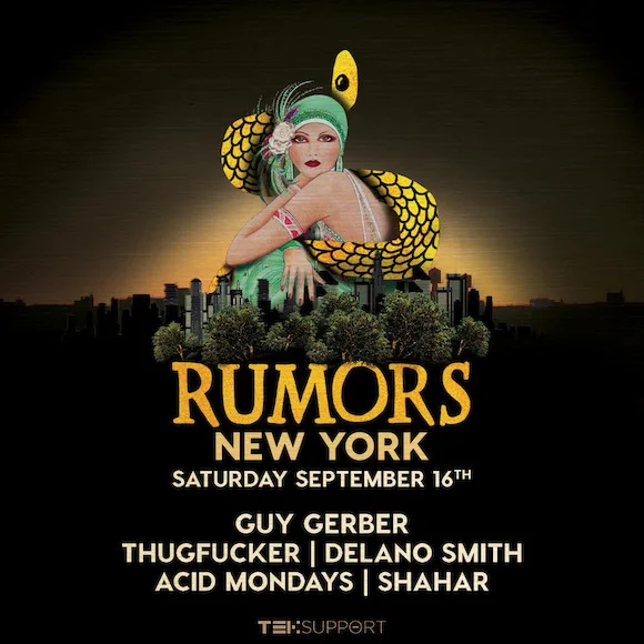 Guy Gerber and NY-based promotion company Teksupport are pulling out all the stops for the party of the year. Eastern exoticism will meet Ibiza’s unique hedonism in America’s dance capital. As ever, Gerber is bringing RUMORS’ singular production to NYC; writhing snakes, Chinese lanterns, dragon dancers, and kimonoed servers will hold court in a sunset outdoor party scene unlike any other.