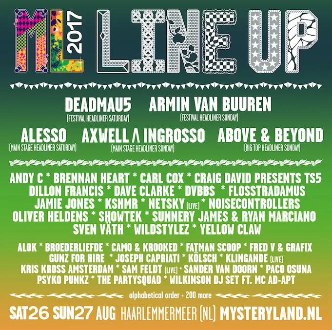 Next to Armin, Axwell /\ Ingrosso have been announced as mainstage headliners. Other highlights include Above & Beyond, Brennan Heart, Carl Cox, Craig David presents TS5, Dave Clarke, Deadmau5, Dillon Francis, Eats Everything, Extrawelt, Gorgon City, Hannah Wants, Ilario Alicante, Kölsch, Miss Kittin, Nastia, Oliver Heldens, Netsky (live), Rebekah, Sam Feldt, Sven Väth, Wilkinson and more. Hardcore empire Thunderdome will also host both festival days.