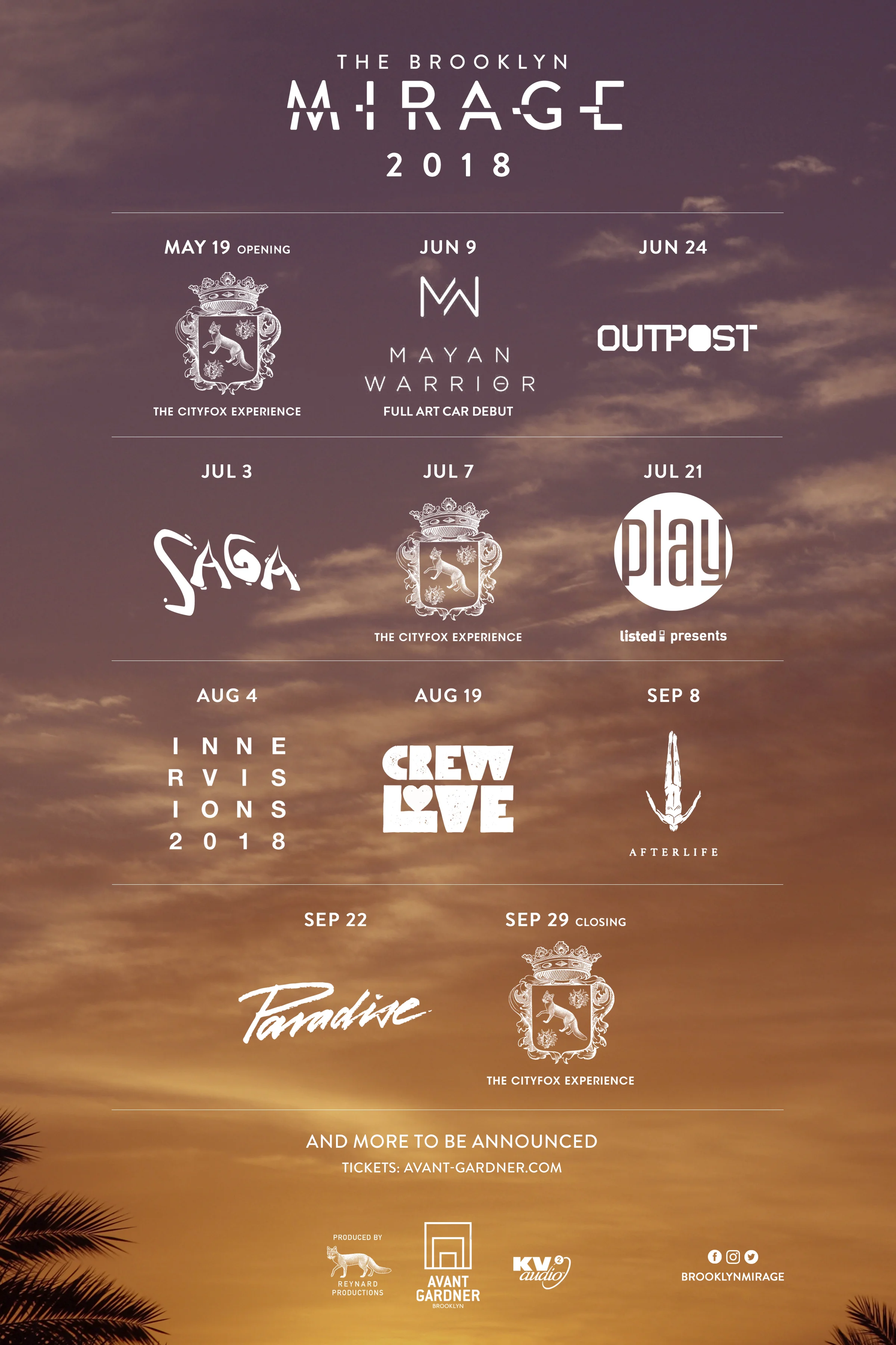The Brooklyn Mirage will welcome New York’s iconic The Cityfox Experience for the opening weekend Saturday, May 19th. Delivering incredible talented techno artists such as Martin Buttrich, ANNA, Serge Devant, Karmon, Holmar, John Tejada (live), Jon Charnis, Mathias Schober & Thomas Herb, Muffs & Mykola, and Sarah Myers. Other dates include midsummer on July 7th and the season's closing event on September 29th.