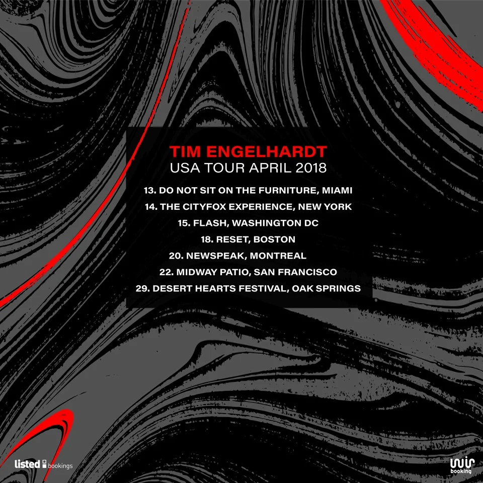 Beginning with his second US tour, Tim Engelhardt will make his first stop in Miami at the intimate nightclub Do Not Sit On The Furniture on April 13th. Next stop will be New York to once again take over the decks at he Cityfox Experience at Avant Gardner on April 14th alongside industry leaders Âme, Tiga and Oliver Schories. Making his way down to Washington, D.C. for a live performance at Flash Rooftop on April 15th. On April 18th Engelhardt will head to Boston for Re:Set Wednesdays at The Phoenix Landing. Then he will perform at Montréal’s Newspeak on April 20th. Making a stop at San Francisco’s Midway Patio on April 22nd. Ending his tour on April 29th, making it one of his biggest performances to date at the sold-out Desert Hearts Festival in southern California.
