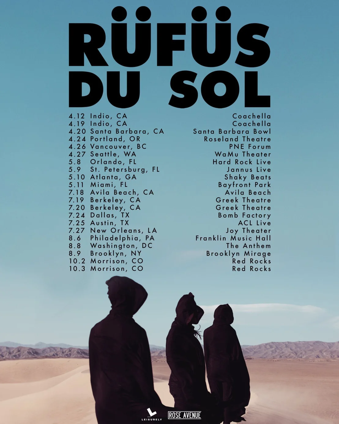 The 2019 announced dates will see them perform at haven, The Brooklyn Mirage in August, Red Rocks Amphitheater, Santa Barbara Bowl, headline Shaky Beats Festival in May, and much more. Be sure to grab your tickets and witness RÜFÜS DU SOL in a town or festival near you.