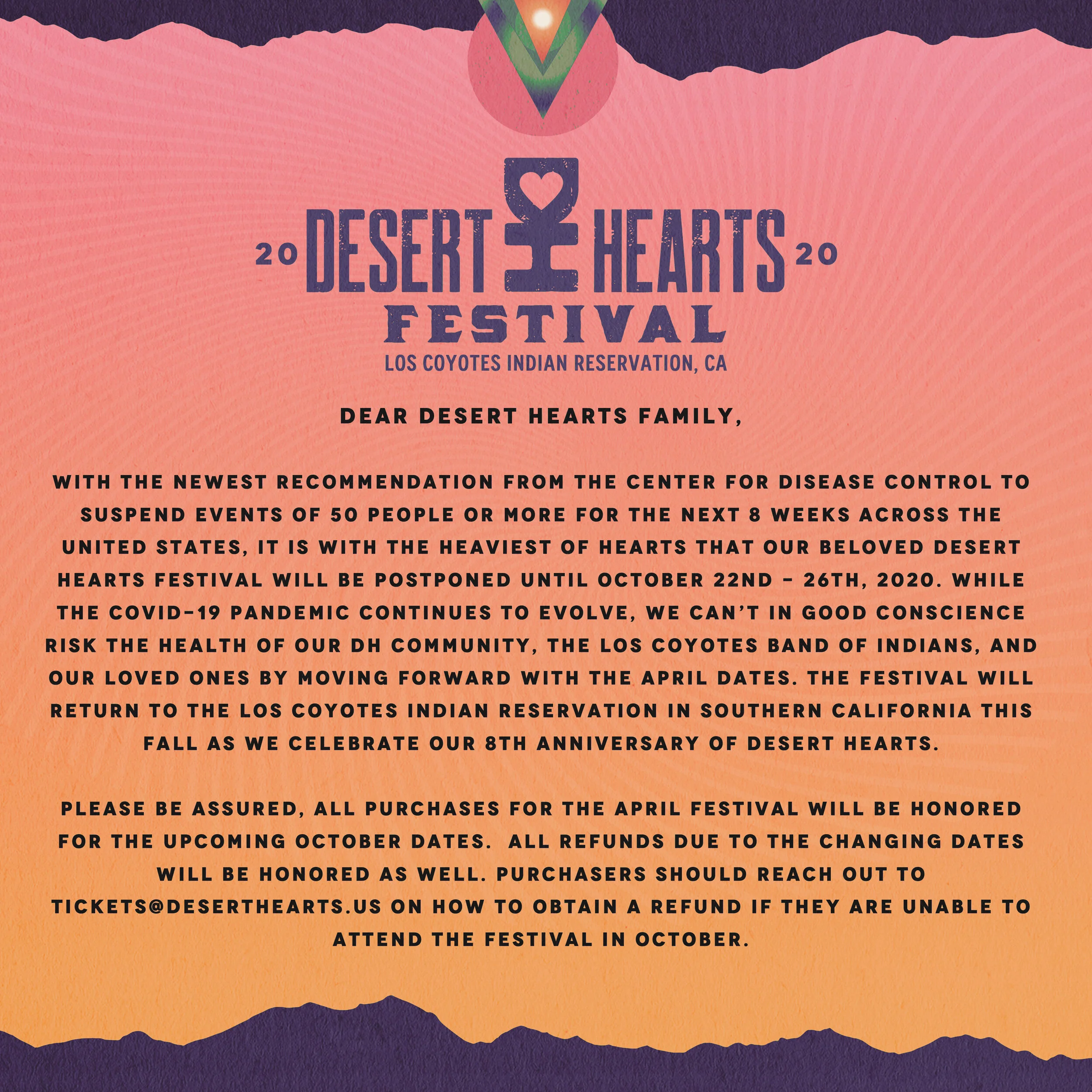 Due to the COVID-19 pandemic, restaurants, events, bars, nightclubs are all closing down including Desert Hearts tour. Unfortunately, the Desert Hearts family has decided to postponed Desert Hearts Festival until Oct. 22nd - 26th, 2020. View their statement below…