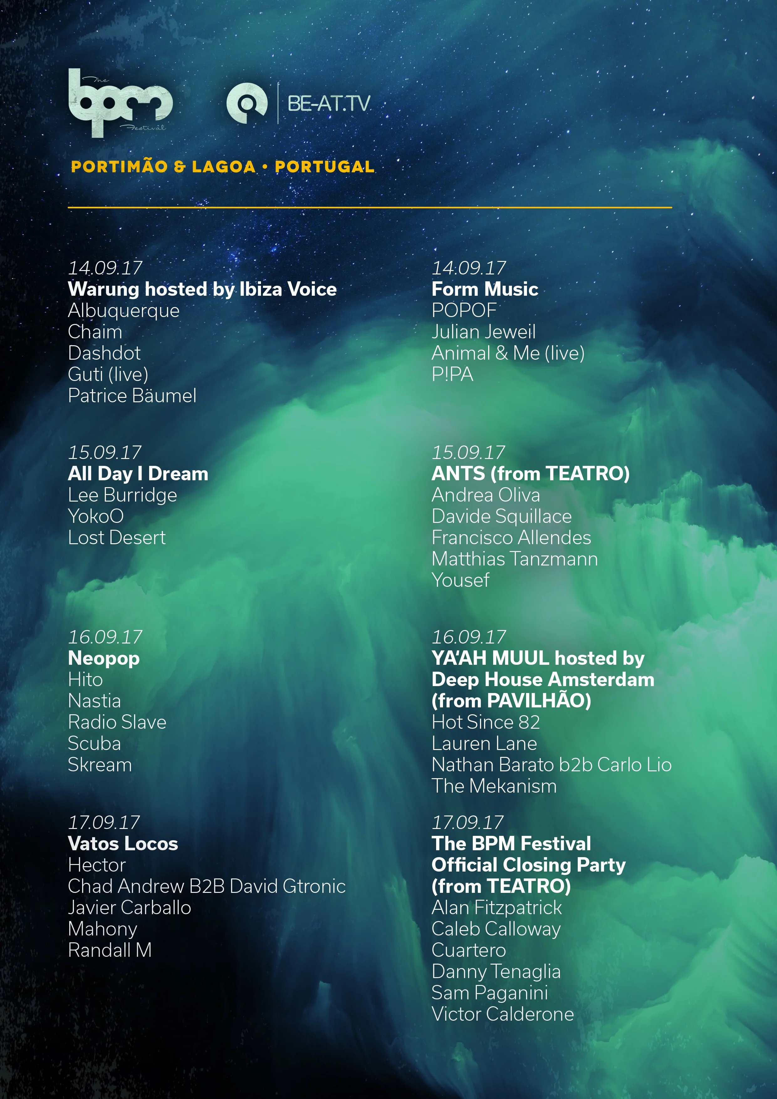 Broadcasting select showcases from the beaches and clubs of Portimão and Lagoa, BE-AT.TV and The BPM Festival will bring live multi-camera high-definition audio and video to any mobile, desktop, or internet enabled TV device for their sixth consecutive festival partnership. With a new set of venues for its first Portuguese edition including beach clubs, nightclubs, and more, fans can virtually explore the new European BPM experience via BE-AT.TV and on Facebook Live via The BPM Festival, artist and label pages. Highlights will include Warung hosted by Ibiza Voice and FORM Music on opening day, followed by All Day I Dream hosted by Überhaus and ANTS, then Neopop and The BPM Festival’s signature event YA’AH MUUL hosted by Deep House Amsterdam on Saturday, January 16, and concluding with Vatos Locos and The BPM Festival Official Closing Party. For anyone unable to physically attend, or to relive the party marathon post-event, fans can visit BE-AT.TV for scheduling and on-demand viewing.