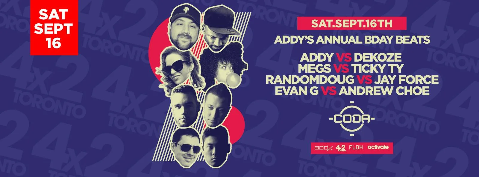 On Saturday, September 16 4x2 is back inside CODA to celebrate the birthday of one of Toronto's favorite local DJs - ADDY!  Calling all friends and music enthusiasts, this is going to be a fam-jam at its finest. In good birthday fashion, ADDY has called upon the crew; Dekoze, Megs, Ticky Ty, Randomdoug, Jay Force, Evan G and Andrew Choe will assist in the night's musical duties.