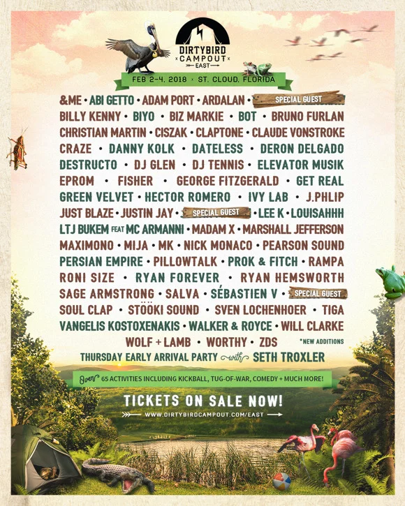 Head Counselor Claude VonStroke has assembled All Your Favorite DJs In The World for the debut DIRTYBIRD Campout East landing in St Cloud Florida February 2nd — 4th. Campers from across the East and beyond will be migrating South for a weekend of fun activities, infinite laughs, and of course all-night dance-floor shenanigans soundtracked by VonStroke’s all-star line-up.