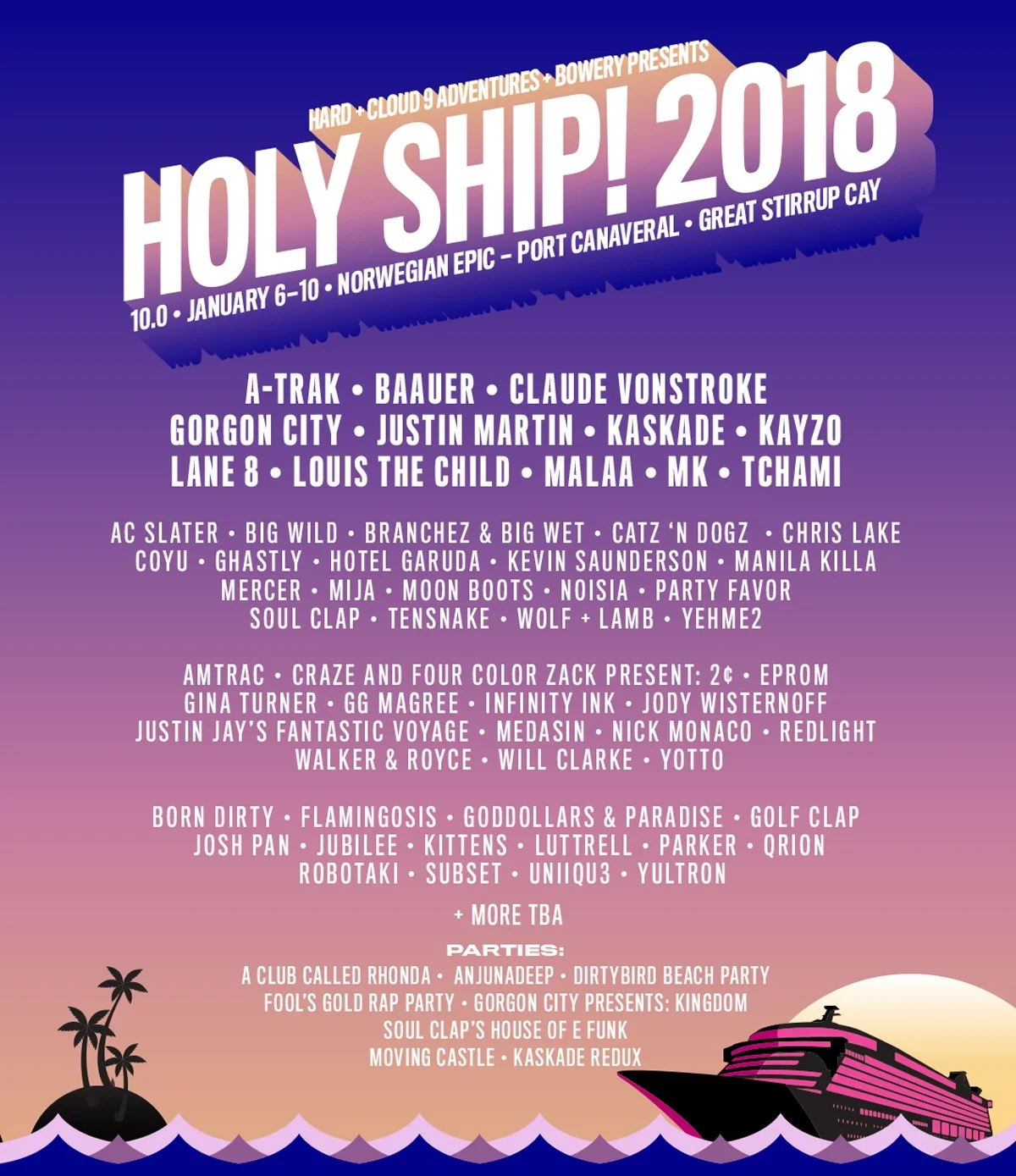 FINALLY the wait Holy Ship! has released the highly anticipated lineups for each of the sold out 2018 back-to- back sailings in January 2018. Presented in partnership by Cloud 9 Adventures, HARD Events, and The Bowery Presents, the reputable fan-favorite dance music cruise returns for the tenth and eleventh sailings with two fully stacked lineups that are too hot to miss. Setting sail on the luxury liner Norwegian Epic, each sailing will embark from Port Canaveral, FL and head to the beautiful Bahamas over the course of four and three nights respectively. Each sailing will feature the famous Holy Ship! Beach Party, to be held on the stunning private island of Great Stirrup Cay in the Bahamas. The complete lineups for each sailing are listed below.