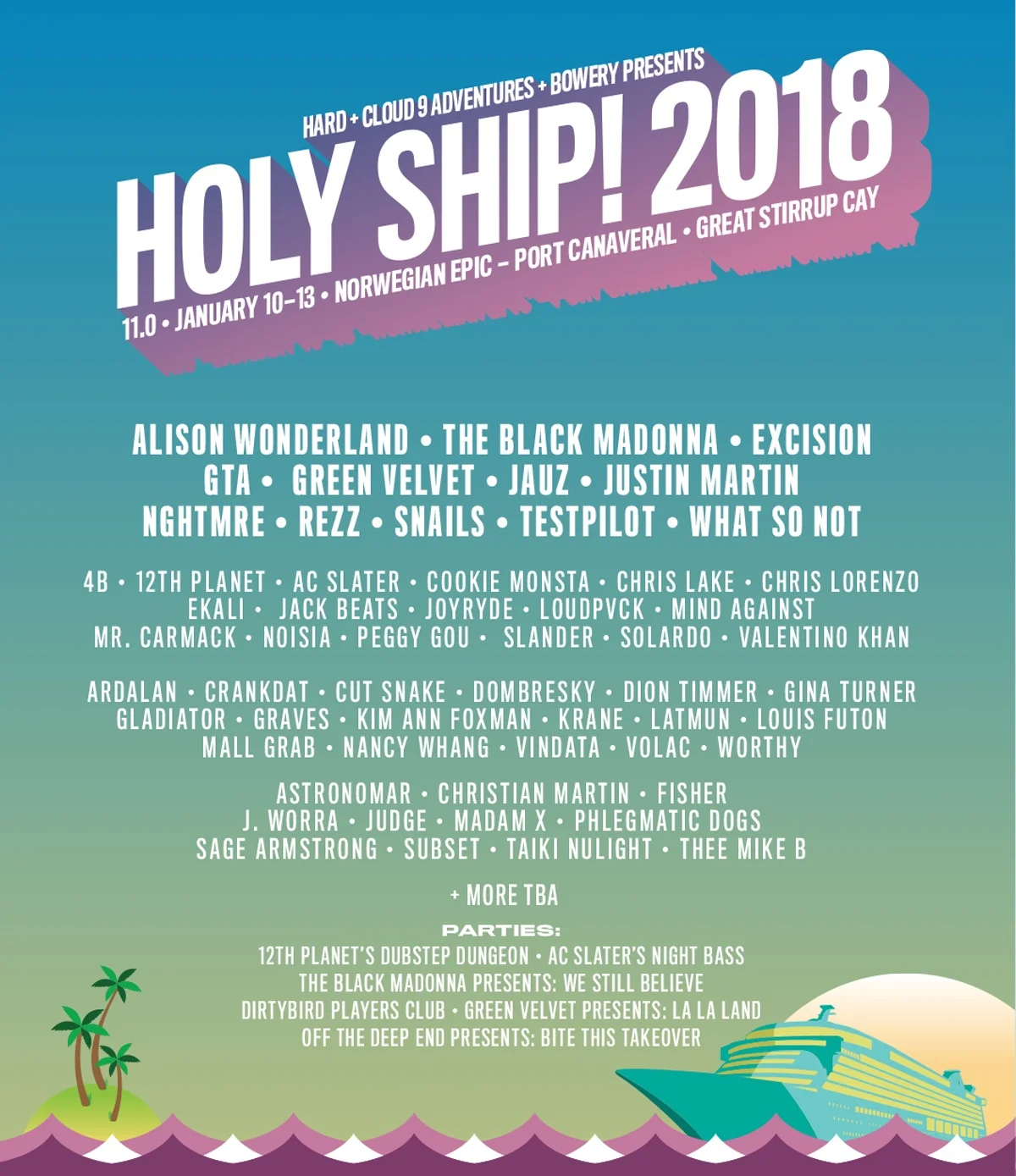Holy Ship! 11.0 Lineups Includes Alison Wonderland, The Black Madonna, Excision, Green Velvet, JAUZ, Justin Martin, NGHTMRE, Testpiolt, What So Not, 4B, 12th Planet, Chris Lake, Slander, Snails, What So Not, Christian Martin + MUCH MORE