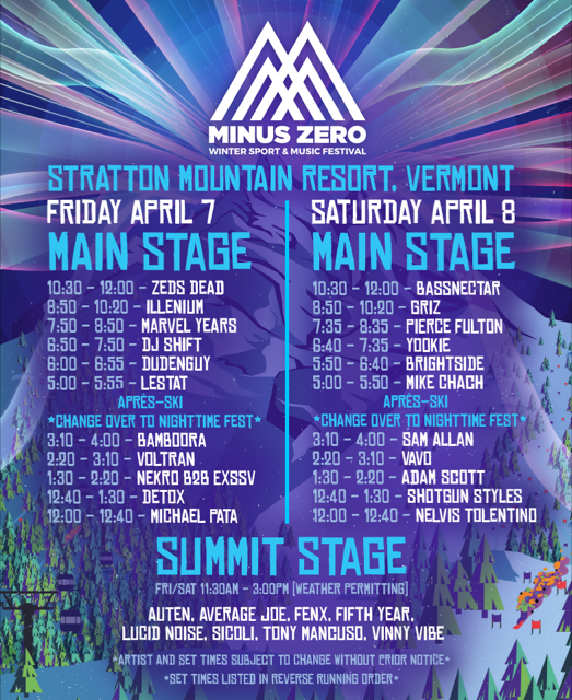 Headlining Friday, April 7 is Zeds Dead with support coming from a wide range of international and northeast regional DJ acts including Illenium, Marvel Years, DJ Shift, Dudenguy, Lestat, Bamboora, Voltran, a back-to-back set from Nekro and Exssv, Detox and Michael Pata. Saturday, April 8, MINUS ZERO festival goers can hit the slopes to the tunes of headliners Bassnectar and GRiZ, along with Stratton native Pierce Fulton, Yookie, Brightside, Mike Chach, Sam Allan, Vavo, Adam Scott, Shotgun Styles and Nelvis Tolentino.