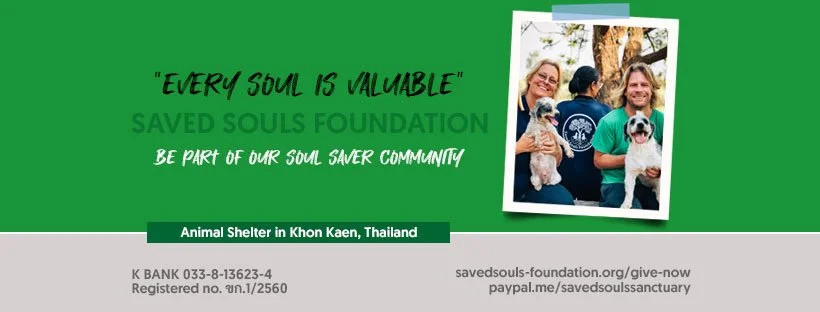 Saved Souls Foundation is a private animal shelter located deep in the heart of Thailand, where dogs rescued from the illegal dog meat trade, abusive situations and accidents, as well as other animals, have found a new loving home. Many of these animals come to us so traumatised that they have lost all trust in mankind. It may take years of intensive socialisation before these dogs are ever ready to trust humans again.